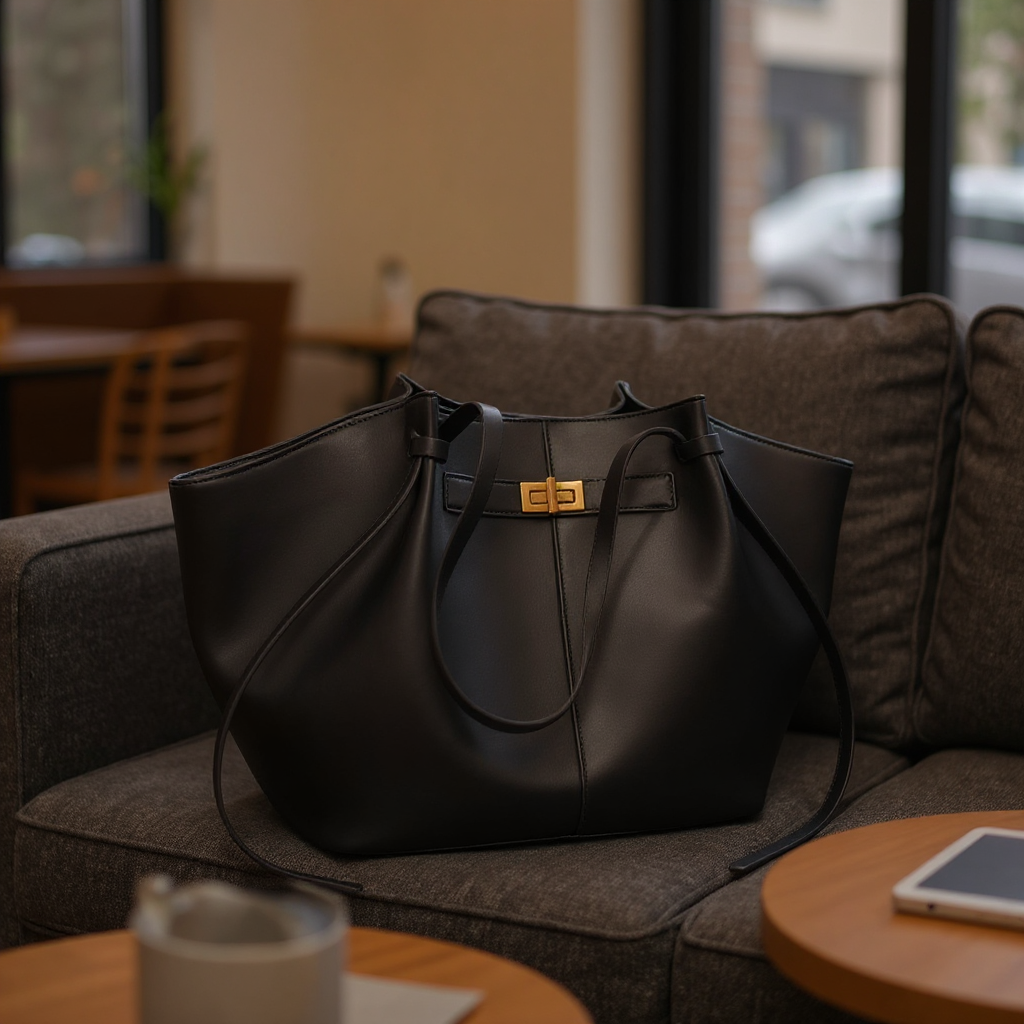 The Tote Bag Céleste® is crafted in premium vegan leather with a soft yet structured silhouette. Featuring double shoulder straps, a golden buckle, and refined leather ties, it elevates any outfit with timeless elegance.