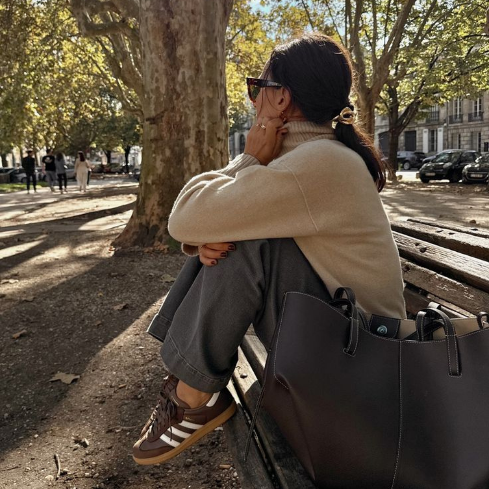 Crafted in premium vegan leather, it can be worn in two ways: as an open, basket-like silhouette with straps on the outside, or as a more rounded, floral-inspired shape with straps crossed inside. Spacious enough to hold a 15” MacBook and your daily essentials, it stays lightweight and comfortable for all-day wear.